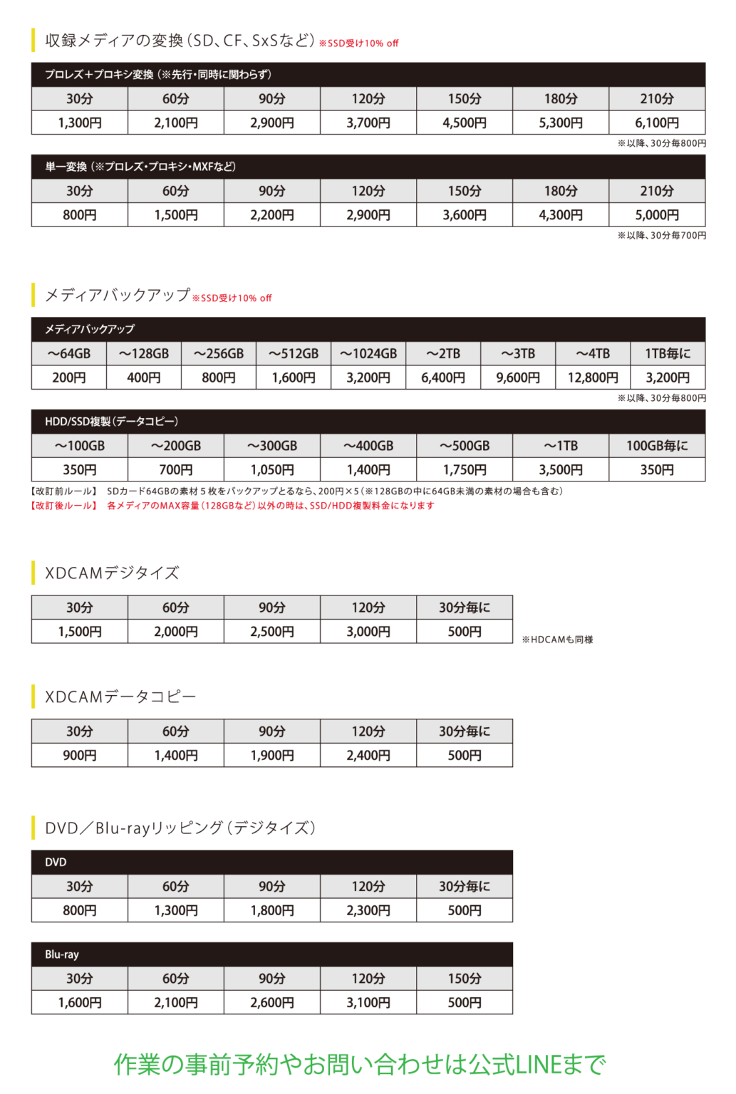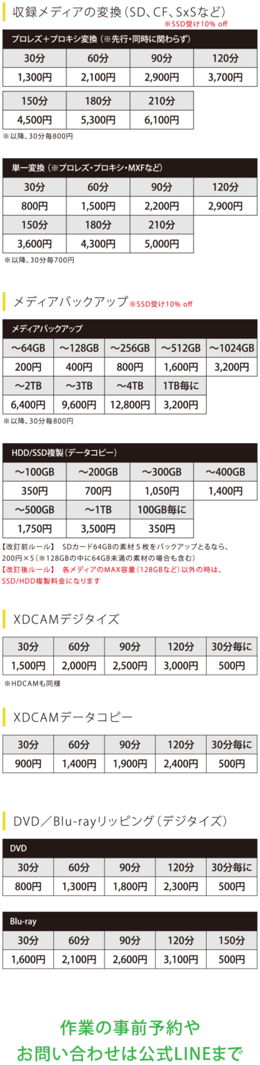 お預かりした素材の取り扱いについては細心の注意を払いますが、作業時におけるノイズ・テープ詰まりやヨレ・切断などのメディア損傷につきましては責任を負いかねますので予めご了承下さい。